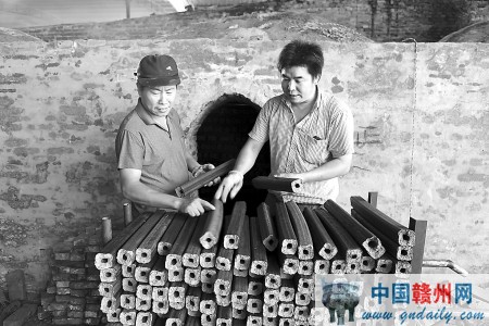 日前,王晓春(右)和工人在竹炭半成品入窑前进行质量检查。 |