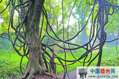 绿荫蔽日、古树虬枝、巨藤盘绕、灌木丛生,瑞金市黄柏乡柏村黄柏小组的一片树林,被村民和慕名前来的游客称为“原始森林”,林边1公里处就是厦蓉高速瑞金北的出口,各种车辆呼啸而过。这里,现代文明与绿色生态相映成趣、和谐统一。