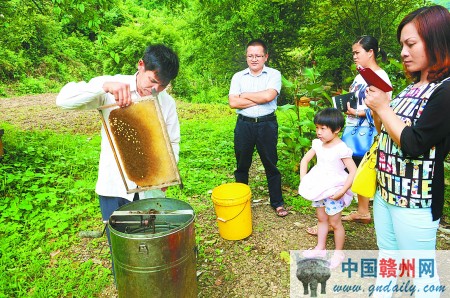 来到蜂场,只见无数飞舞的小蜜蜂,而蜂场的主人钟华良正在忙碌着。见我们到来,钟华良立即停下手中的活,热情地迎了上来。钟华良从一个透明的瓶中,给我们每个人倒出小半碗新鲜蜂蜜,再兑上温开水。“我们的蜂蜜是原生态的,广东的老板都亲自上门订购,销路问题不用担心。”一边喝着香甜的蜂蜜,一边听他谈养蜂经。