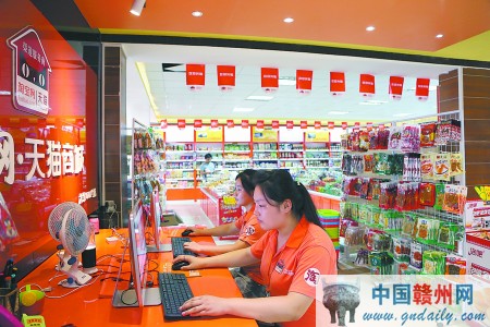 近日,记者来到位于大余县城中心地段的粤淘电子网络商务有限公司淘宝网·天猫实体体验馆,这里将商品分成了十多个专区,种类从进口食品到日化百货,甚至服装、电器,令前来购物的市民们目不暇接。与实体体验馆相对应的,是公司的线上商场,收银台右侧,几位工作人员正在电脑前忙着与网购的客户交流。
