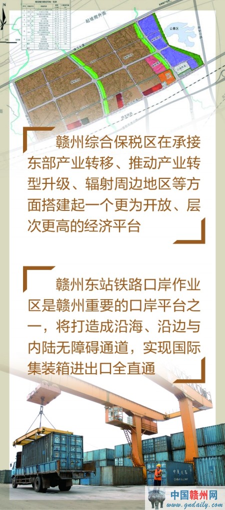 长期以来,不沿海、不沿边的赣州,一直为“内陆”所困,进出境物流成本高、产业配套服务体系不完善,严重制约赣州经济发展。赣南等原中央苏区振兴发展战略的实施,为赣州提供了“内陆”变“前沿”的机遇。赣州紧紧围绕《国务院关于支持赣南等原中央苏区振兴发展的若干意见》提出的“建设内陆开放型经济示范区”战略目标,加快构建对外开放新格局,着力打造具有现代物流业态特征的新型内陆口岸,以大开放推进大发展。目前,赣州综合保税区正在加紧建设中;进口水果、进口再生原料、进境饲料用粮谷等检验检疫监管区正在认证与推进中;赣州东站铁路口岸作业区正着手扩容增效。