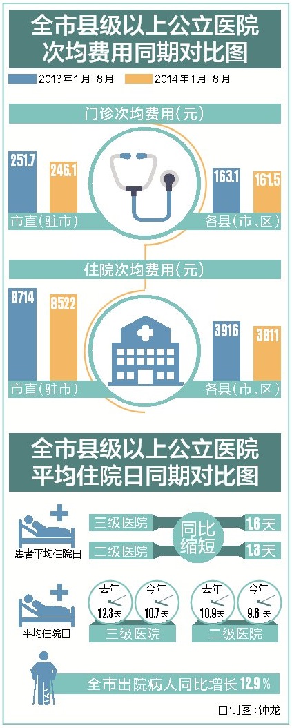 1月至8月,全市51家二级以上公立医院的门诊次均费用同比平均降幅1.96%,最高降幅32.86%,减少39.9元;住院次均费用同比平均降幅1.18%,最高降幅15.25%,减少391.5元。