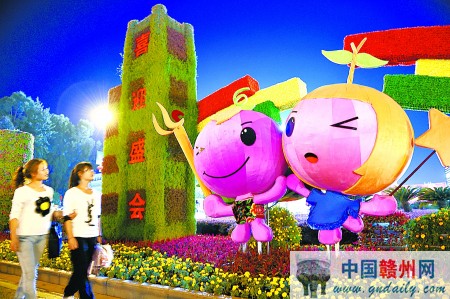 10月20日晚,市民从赣州市南门文化广场上省运会吉祥物“圆圆”“萌萌”的造型前经过。第十四届省运会即将开幕,形式多样的景观造型、灯笼、彩旗把赣州市中心城区装点一新,街头洋溢着喜庆热烈的氛围。记者刘凯 吴书梅 摄