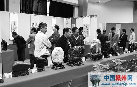 11月7日,上犹县举办第五届观赏石文化博览会,书法、诗词、观赏石的巧妙融合让会场展厅别有韵味。 罗江华 摄
