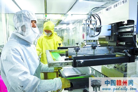 近日,龙南县宏业成科技有限公司技术人员正在生产液晶显示产品。该公司总投资3.3亿元,主要生产液晶显示屏、电容触摸屏等,产品远销欧美。