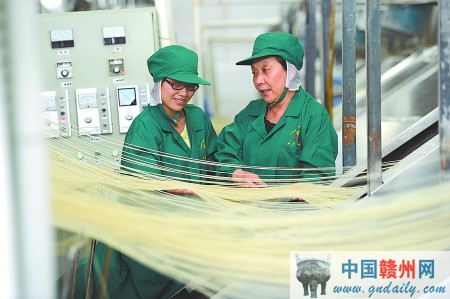 近年来,会昌县发挥龙头企业的带动作用和合作社的竞争力,促进米粉生产企业产销一体化。图为江西五丰食品有限公司的员工在米粉生产车间内作业。(资料图片) 李景录 摄