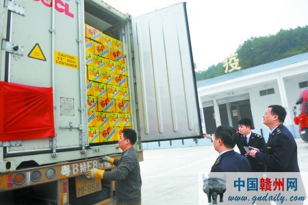 这两天,我市最大的脐橙出口商之一赣州龙腾农业发展有限公司正在为出口订单的报关、报检、发货而忙碌。据该公司董事长魏培腾介绍,今年,公司包括脐橙在内的全部货物都将在定南公路口岸作业区直接通关。通过口岸作业区这个“无水港”,该公司每一车货物至少可以节省物流成本1000多元,时间上也能节约3至5天。口岸作业区的建设和投入运营,为该县及周边县、市的进出口货物提供了高效快捷畅通的通关服务,降低了企业物流成本,开辟出一条连接港口、通向世界的“黄金水道”。随着2014年脐橙采摘、销售季节的到来,从今年11月起至明年3月,全市将有8万吨脐橙在这里实现集中通关,出口创汇可达8亿美元。