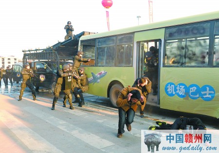 12月18日下午,2014赣州市公安机关反恐实战演练活动在赣州黄金机场举行。图为演练过程中,特警、武警强攻组向被“劫持”的机场大巴发动强攻,击毙“暴徒”,解救“人质”的场景。记者何敏 摄