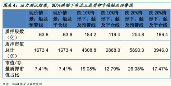 国金证券测算了沪深300指数跌幅分别为0、10%、20%三种情景下的股权质押市值触及预警线和平仓线指标。结果显示: