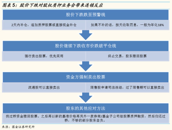 如果市场波动进一步增加,股权质押风险将会逐渐显现,在这种假设前提下,国金证券认为,假设在一个持续下跌的市场中,股权质押标的股票的跌幅达到一定程度会引发连锁反应,如果股东不做出相应的应对措施的话,标的股票的卖出压力会很大,而这又可能导致标的股票的进一步下跌,所以这样的一个恶性循环将会是大股东不愿意看到的。因此,股权质押公司的大股东或会采取行动。