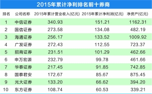 2015年累计净利润超过100亿的券商共有5家。其中,国信证券超越净资产为其两倍有余(1009.92亿元)的海通证券,排名第二。2015年国信证券实现营收273.58亿元,净利润134.08亿元。排在第三的是海通证券,净利润133.52亿元。排名第四的是广发证券,净利润112.55亿元。排名第五的是招商证券,净利润101.29亿元。