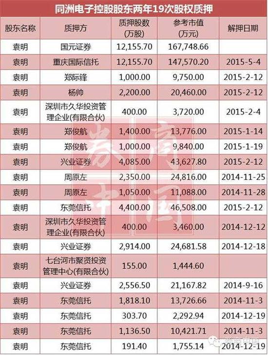 在股权质押融资上,袁明应该算得上是个绝对熟手,这次是首次“玩出火”。数据显示,袁明自2014年以来共对同洲电子进行过19次股权质押,质押方合计10个主体,包括2家券商、2家信托公司、2家一般公司和4位自然人,其中部分股权质押记录有较为明显的“借新还旧”痕迹。