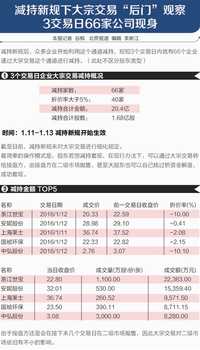 根据 WIND 数据显示,1月11日开始,共计66家上市公司通过大宗交易渠道减持,总金额合计20亿,减持股份规模为1.68亿股。