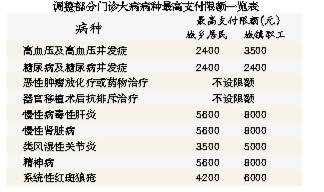 据介绍,此次将高血压和有并发症的高血压病合并为高血压及高血压并发症、糖尿病和有并发症的糖尿病合并为糖尿病及糖尿病并发症。调整高血压及其并发症、糖尿病及其并发症、恶性肿瘤放化疗、器官移植抗排异治疗、慢性病毒性肝炎、慢性肾脏病、类风湿性关节炎、精神病、系统性红斑狼疮等门诊大病病种最高支付限额。