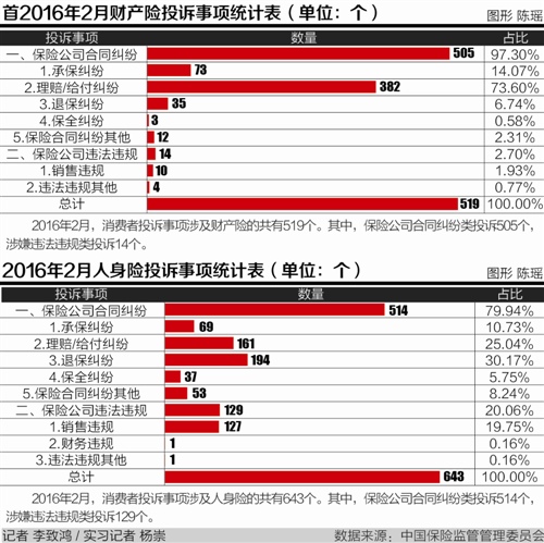 2016年2月,消费者投诉事项涉及财产险的共有519个。其中,保险公司合同纠纷类投诉505个,涉嫌违法违规类投诉14个。