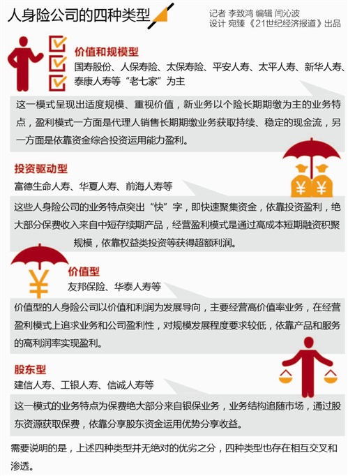 根据21世纪经济报道记者对人身险公司的梳理及对20余位资深人士的采访后发现,人身险公司基本分为四种类型,分别是价值和规模型、投资驱动型、价值型和股东型。