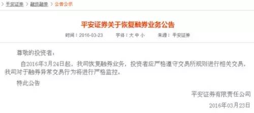 平安证券官网发布公告称自2016年3月24日起恢复融券业务,投资者应严格遵守交易所规则进行相关交易,平安证券对于融券异常交易行为将进行严格监控。