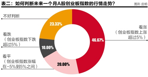而对于未来一个月A股创业板指数的行情走势的判断中,上述30位投资总监的答案为:看涨(创业板指数上涨超过5%)的有14位,占比46.67%;看平(创业板指数涨幅在-5%到5%之间)的有6位,占比20.00%;看跌(创业板指数下跌超过5%)的有3位;认为不好判断的有7位(见表二)。