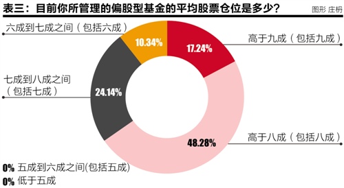 其中,仓位高于九成(包括九成)的有5位,占比17.24%;仓位高于八成(包括八成)的有14位,占比48.28% ;仓位在七成到八成之间(包括七成)的有7位,占比24.14%;仓位在六成到七成之间(包括六成)的有3位;没有仓位低于六成的(见表三)。
