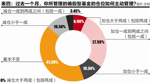 其中,加仓大于两成(包括两成)的有2位,占比6.90%;加仓一成到两成之间(包括一成)的有8位,占比27.59%;加仓小于一成的3位,占比10.34%;仓位基本不变的有12位,占比41.38%;减仓小于一成的有3位,占比10.34%;减仓一成到两成之间(包括一成)的有1位;没有减仓大于两成(包括两成)的(见表四)。