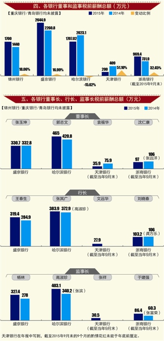 已披露2015年董事和监事薪酬的银行有3家,分别是锦州银行、盛京银行和哈尔滨银行。去年这一薪酬最高的是盛京银行,2644.9万元,同比增长16.88%,锦州银行同比增长18.06%至1700万元。与此同时,哈尔滨银行缩水15.62%至1707.02万元。截至去年9月末,天津银行董事和监事薪酬缩水51.1%至200万元。不过,天津银行在年报中写到,截至2015年9月末的9个月的酌情花红未能于年底前厘定。