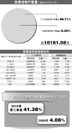 近年来,我国投资者的持股结构已发生一些重要变化。据中国结算数据显示,截至2016年2月份,我国股票市场,投资者账户数量共有10161.08万,其中个人投资者账户数量为10132.09万,占比99.71%,机构投资者账户数量为28.99万,占比为0.29%。