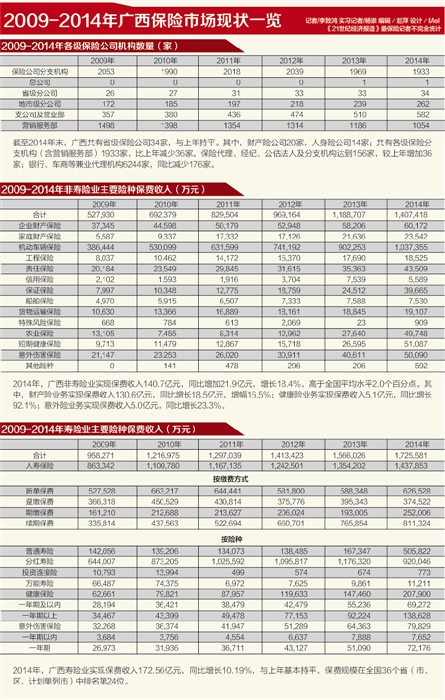 广西保监局官网数据显示,截至2014年末,广西共有省级保险公司34家,与上年持平。其中,经营财产险业务的20家,经营人身险的14家;共有各级保险分支机构(含营销服务部)1933家,比上年减少36家。