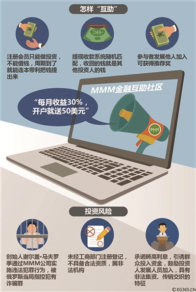 今年1月,银监会、工业和信息化部、人民银行和工商总局发出提示称,“MMM金融互助社区”及类似主体不具备合法资质且运作模式具有非法集资、传销特征。此类运作模式风险巨大,一旦资金链断裂,投资者将面临严重损失。四部委提示广大公众切实提高风险意识和法律意识,自觉抵制参与,维护自身财产安全。同时表示,按照有关规定,参与非法集资不受法律保护,风险自担,责任自负;参与传销属于违法行为,将依法承担相应责任。据北京青年报