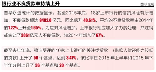 根据普华永道统计的数据显示,截至2015年底,18家上市银行的信贷风险有所增加,不良贷款额达9482.8亿元,同比飙升48.61%,平均的不良贷款率由2014年的1.22%上升至1.65%。为应对风险增加,上市银行相应加大了力度处理,共注销或转让了3861亿元不良贷款,较2014年增加了67%。