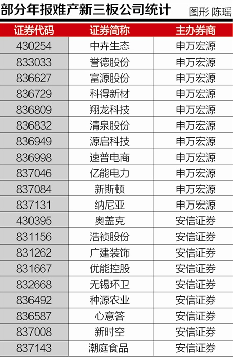值得一提的是,在上述62家年报“难产”的新三板企业中,申万宏源作为主办券商的企业多达11家,位居榜首。