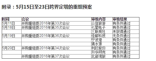两起跨界定增的过会,也使得跨界并购的势头加速回暖。不少市场观点已提出,跨界定增疑虑已可打消;同时,上市公司也陆续发布相关的重组预案。据不完全统计,自5月15日证监会回应“叫停跨界定增”至5月23日的一周内,已有宏达新材、王子新材、\*ST金瑞、联创光电、达意隆发布了涉及跨原有主业的非公开发行预案,并购标的分别涉及移动互联网、数字营销、影视和游戏等热门行业。