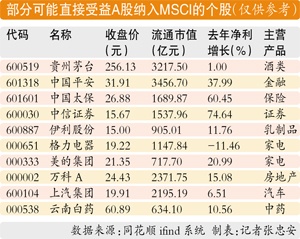 申万宏源分析师王佳音表示,由于纳入MSCI的A股需要反映市场整体特征。因此,根据市值、估值、业绩及稀缺性指标来看,受益个股主要集中于大盘蓝筹股。华泰证券研究员薛鹤翔认为,低估值蓝筹和消费股是A股纳入MSCI的直接受益股,最看好金融、医药、地产、汽车等估值低于行业历史五年均值的行业,如光大银行、招商银行、上汽集团等。
