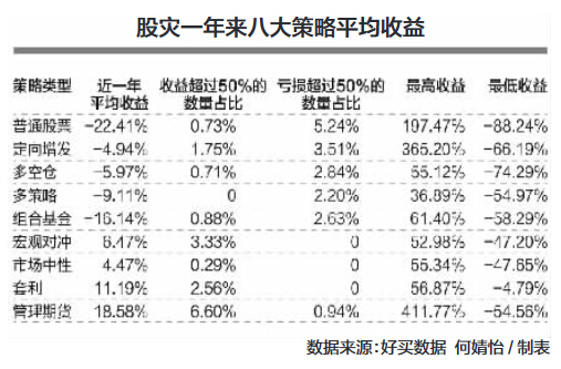 数据显示,私募去年各大策略产品发行数量都有明显的增长,在股灾以来的一年中,它们的表现大相径庭。其中,跟股票市场相关度较高的定向增发、多策略、多空仓等策略私募业绩惨淡,最近一年平均收益分别为-4.94%、-9.11和-5.97%。由于目前国内FOF产品选取的子基金仍是以股票策略产品为主,组合基金策略的产品近一年平均收益亏损度仅次于股票型产品,为-16.14%。