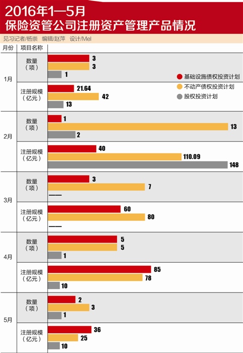 6月13日,21世纪经济报道记者从中国保险资产管理业协会获悉,2016年5月,5家保险资产管理公司共注册各类资产管理产品6项,合计注册规模71亿元。其中,基础设施债权投资计划2项,注册规模36亿元;不动产债权投资计划3项,注册规模25亿元;股权投资计划1项,注册规模10亿元。
