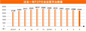 网贷之家最新数据显示,截至6月底,网贷(P2P)行业正常运营平台数量为2349家,已连续数月减少。此外,P2P行业综合收益率也连续6个月下行,降至10.38%。