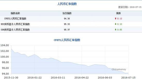 据统计截至7月15日CFETS人民币汇率指数报94.38点,较2015年年末贬值6.498%。CFETS人民币汇率指数以2014年12月末为基期,指数记为100点。