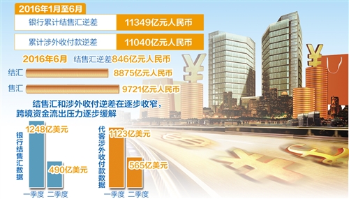 2016年1月至6月,银行累计结售汇逆差11349亿元人民币(等值1738亿美元)。累计涉外收付款逆差11040亿元人民币(等值1688亿美元)。
