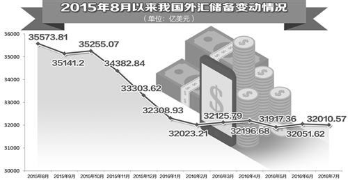2015年7月,外汇储备规模为36513.10万亿美元,至2016年7月,下降4502.53亿美元。但外储下降呈现明显的阶段性特征。去年三季度和四季度,外汇储备总体上呈现下降趋势,除2015年10月出现单月上升之外,其他各月均有400亿美元以上的下降。