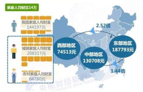 报告显示,2015年我国家庭人均财富为144197元,城镇家庭和农村家庭的人均财富分别为208317元和64780元。