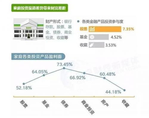报告显示,从城乡家庭的投资渠道看,在参与各类金融产品投资的家庭中,股票的投资参与度相对最高,占到了全部调查家庭的7.35%。投资基金的家庭占全部 家庭的4.52%,投资收藏的家庭只占到全部家庭的3.53%。城镇家庭对各类金融产品投资的参与度都要高于农村家庭,10.56%的城镇家庭进行了股票 投资,这一比重约是农村家庭的4倍。