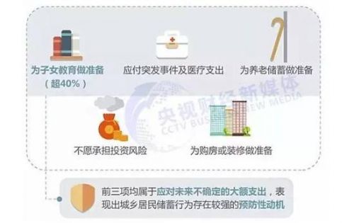 从家庭进行储蓄的动机分析,位居首位的是“为子女教育做准备”,超过40%的家庭都将其作为储蓄原因。其次分别是“应付突发事件及医疗支出”“为养老储蓄做准备”“不愿承担投资风险”“为购房或装修做准备”。可见,预防性动机是城乡家庭储蓄行为的主要动因。