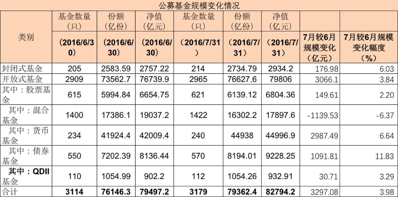 每个月一次的公募基金规模变化往往是每一类基金规模的迁徙,7月份这一次旅行,是货币基金和债券基金携手带来超4000亿的增量,但是混合基金拖累了1000多亿,让7月底公募基金总规模8.28万亿,离历史高点仅一步之遥。