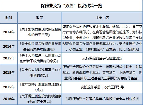 此前,“新国十条”和《关于保险资金投资创业投资基金有关事项的通知》、《关于设立保险私募基金有关事项的通知》中均为险资投资创业投资基金及设立包括创业投资基金在内的私募基金,专项支持中小微企业发展开闸。2015年6月国务院曾发布《关于大力推进大众创业万众创新若干政策措施的意见》提出,支持保险资金参与创业创新,发展相互保险等新业务,进一步降低商业保险资金进入创业投资的门槛。