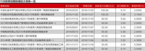 根据同花顺的统计,11月份到期的债券中,除去国债、地方债和银行间的同业存单,单只到期规模超过50亿的债券达到28只(部分较大规模即将到期债券详情见图表)。