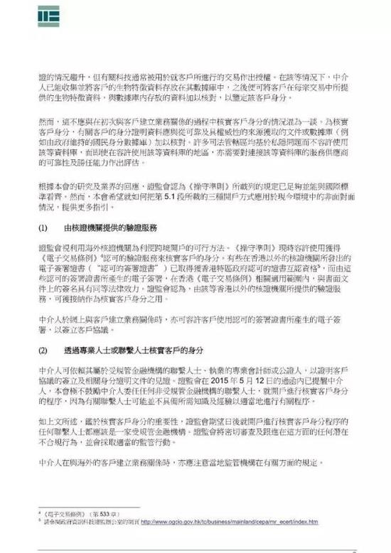据香港证监会通知函附件,共有3种非面对面具体的验证手段。 此次《通函》所称的“已获得香港特区政府‘证书互认资格’的海外核证机关,所发出的电子证书、电子签名,与书面文件具有同等法律效力,香港证监会接纳其作为核实客户身份之用”。这即是香港的券商在网上为客户开户时,也允许客户使用这些电子证书所产生的电子签名来签立客户协议。