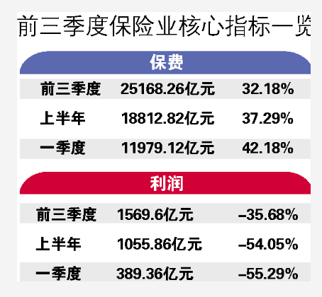 与保险业务规模形成强烈反差的是净利的下滑。保险业预计前三季度利润总额1569.60亿元,同比减少870.59亿元,下降35.68%。其中,产 险、寿险、再保险、资管公司预计利润总额482.44亿元、819.5亿元、50.66亿元和56亿元,较去年同期相比分别下降29.35%、 47.15%、 32.61%和 23.68%。