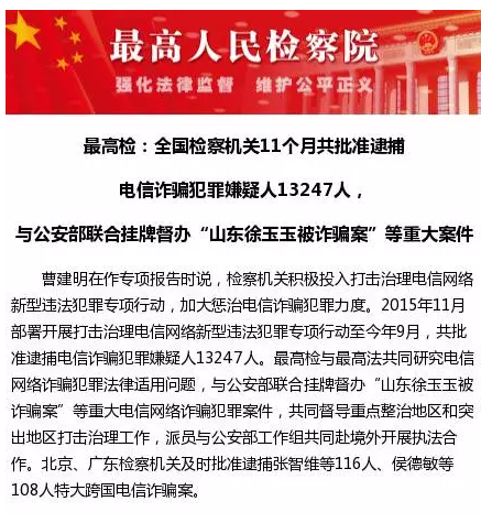 据最高人民检察院5日通报,2015年11月至今年9月,全国检察机关11个月共批准逮捕电信诈骗犯罪嫌疑人13247人。