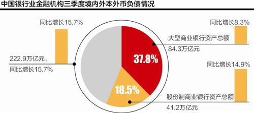 截至三季度末,我国银行业金融机构境内外本外币资产总额为222.9万亿元,同比增长15.7%。其中,大型商业银行资产总额84.3万亿元,占比37.8%,同比增长8.3%;股份制商业银行资产总额41.2万亿元,占比18.5%,同比增长14.9%。
