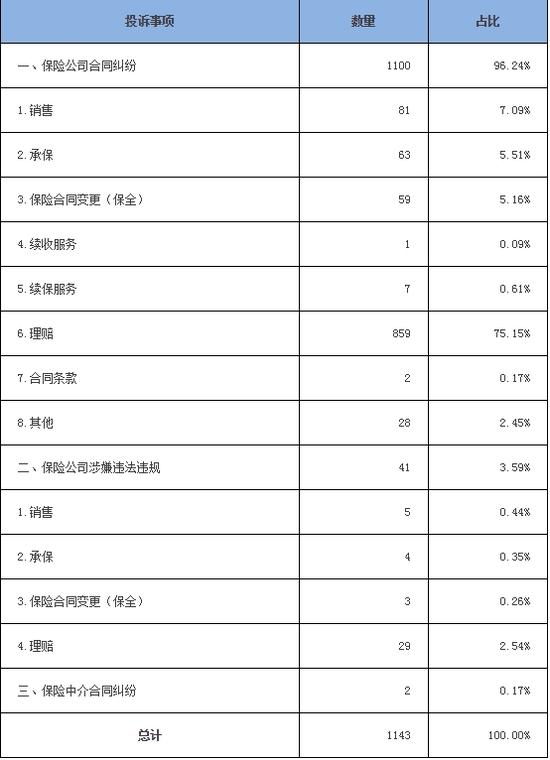 消费者有效投诉涉及财产险的共有1143件。其中,保险公司合同纠纷类投诉1100件,涉嫌违法违规类投诉41件;保险中介机构合同纠纷类投诉2件。涉及财产险的保险公司合同纠纷类有效投诉中,理赔纠纷859件,占合同纠纷投诉总量的78.09%,集中反映了在车险理赔环节,对定损金额、核赔金额、理赔时效等问题不满。销售纠纷81件,占合同纠纷投诉总量的7.36%,主要反映出险记录导致保费上浮争议、投保礼赠送争议、未经同意承保等问题。承保纠纷63件,占合同纠纷投诉总量的5.73%,主要反映退保时效长、退保流程繁琐等问题。