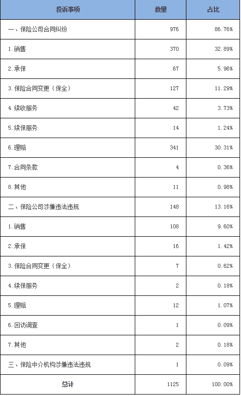 消费者有效投诉涉及人身险的共有1125件。其中,保险公司合同纠纷类投诉976件,涉嫌违法违规类投诉148件;保险中介机构涉嫌违法违规类投诉1件。涉及人身险的保险公司合同纠纷类有效投诉中,销售纠纷370件,占合同纠纷投诉总量的37.91%,主要反映夸大保险责任或保单收益、隐瞒保险期间、隐瞒缴费期限、隐瞒退保损失等问题。理赔纠纷341件,占比34.94%,主要反映对理赔时效、理赔金额、保单责任认定等不满。保全纠纷127件,占比13.01%,主要反映退保金额少、退保时效长等问题。